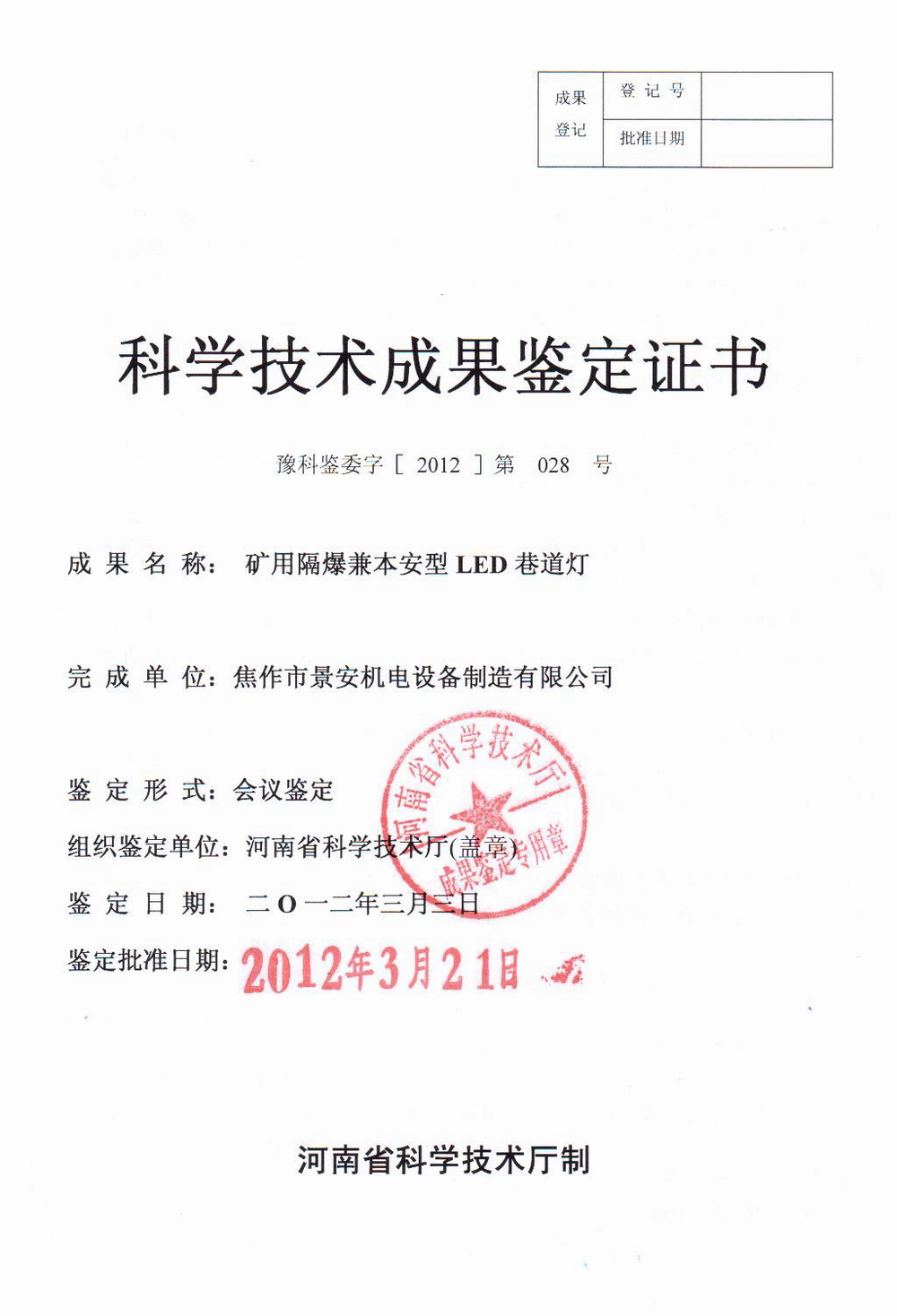 2012年3月21日,我公司研制開(kāi)發(fā)的“礦用隔爆兼本安型LED巷道燈”項(xiàng)目通過(guò)河南省科技廳組織的科技成果鑒定,鑒定委員會(huì)一致認(rèn)為:本項(xiàng)目達(dá)到同類(lèi)產(chǎn)品國(guó)內(nèi)領(lǐng)先水平。該項(xiàng)目采用本質(zhì)安全電源技術(shù),設(shè)計(jì)了本質(zhì)安全型疊加恒流源電源,使燈具運(yùn)行穩(wěn)定、安全、可靠;采用防靜電技術(shù)設(shè)計(jì)了光學(xué)透明罩和防塵罩;進(jìn)行了合理的結(jié)構(gòu)設(shè)計(jì),金屬防護(hù)外殼為LED光源散熱,保證燈具連續(xù)使用下微光衰,長(zhǎng)壽命,并且具有良好的防塵、防水、防腐性能。